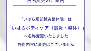 平素よりご来院いただき、誠にありがとうございます。このたび当院は**「いはら服部鍼灸整体院」**から**「いはらボディケア(鍼灸・整体)」**へ名称を変更いたしました。名称は変更となりましたが、施術方針やコンセプトに変わりはございません。こ...
